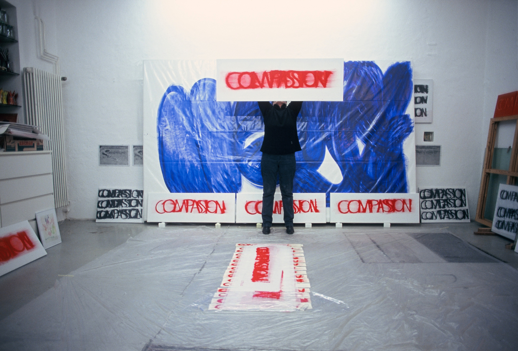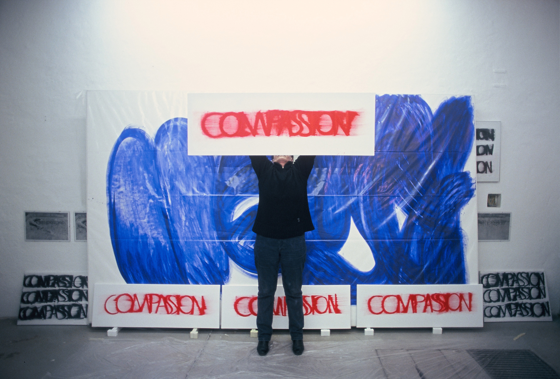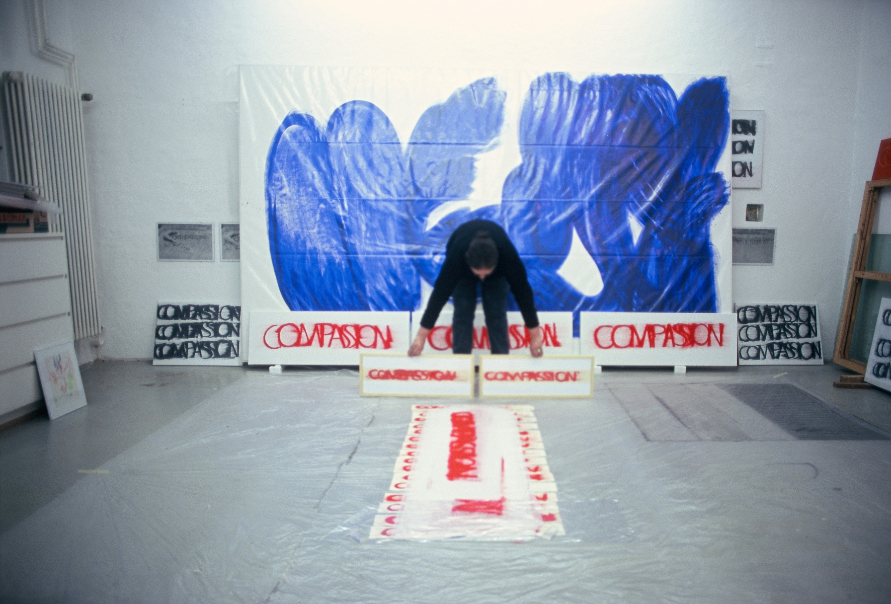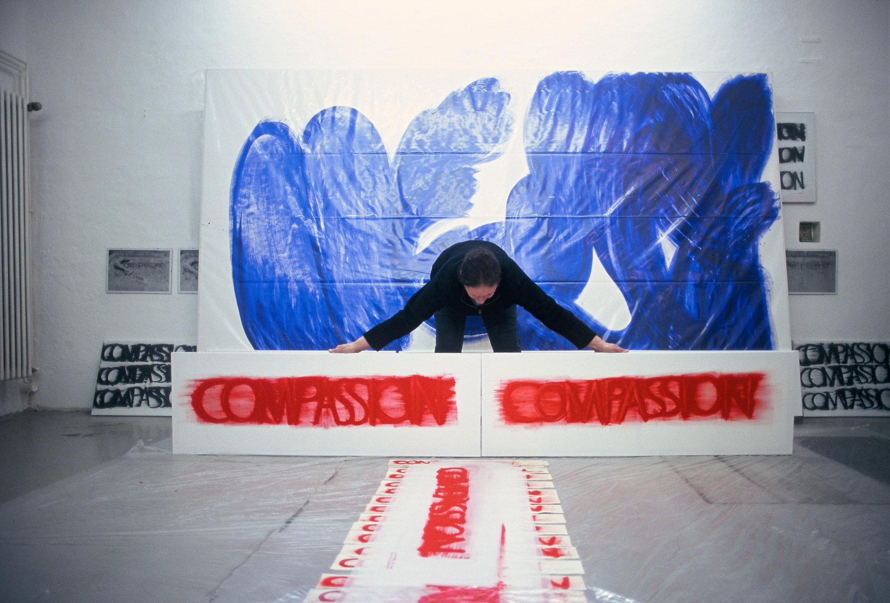 DIE BLAUE ZEIT FÜR ECCE HOMO BEGANN MIT 56 EXERZITIEN auf Karton(70cm x 100cm) +führte 1987 zum großen Tafelbild : MENSCH IN BLAU,1987 - 225cm x 357cm, das anlässlich der documenta in Kassel gezeigt wurde. Annalies Klophaus