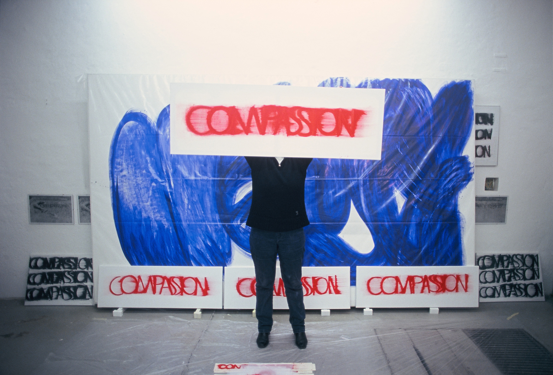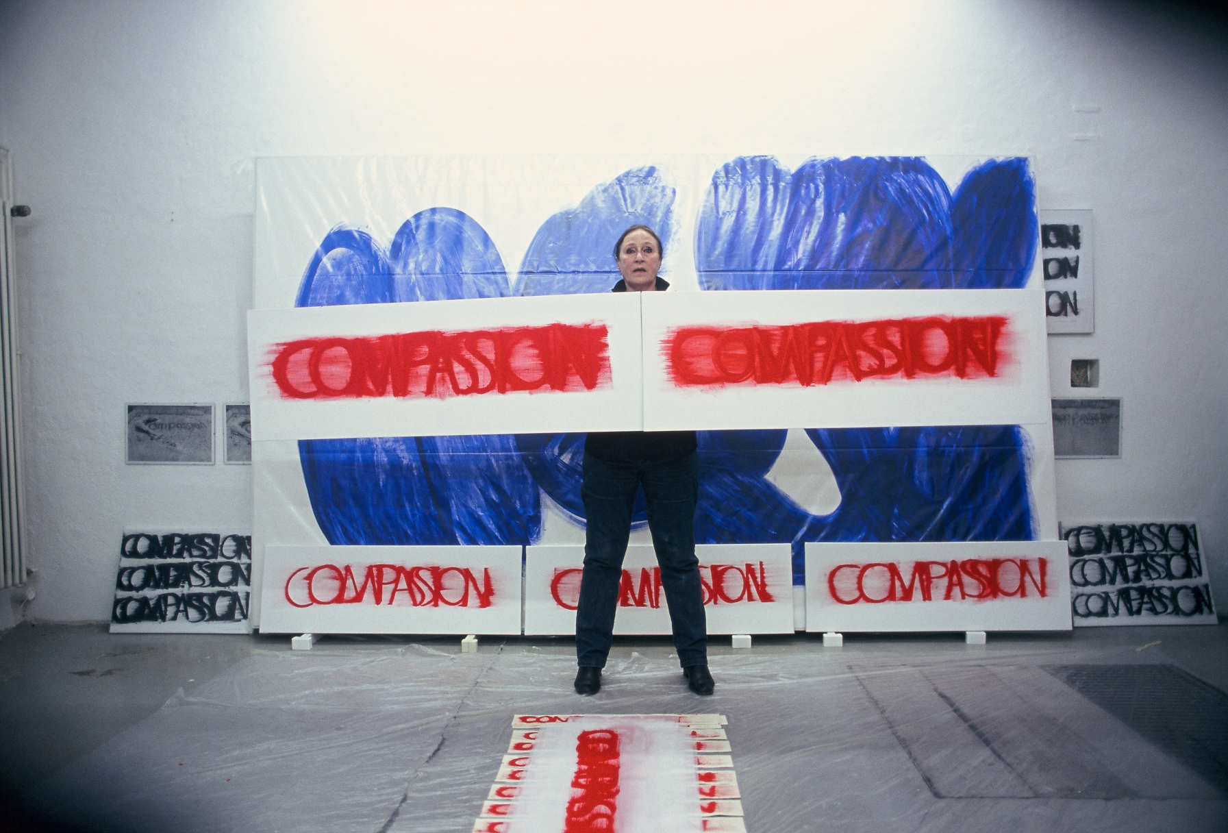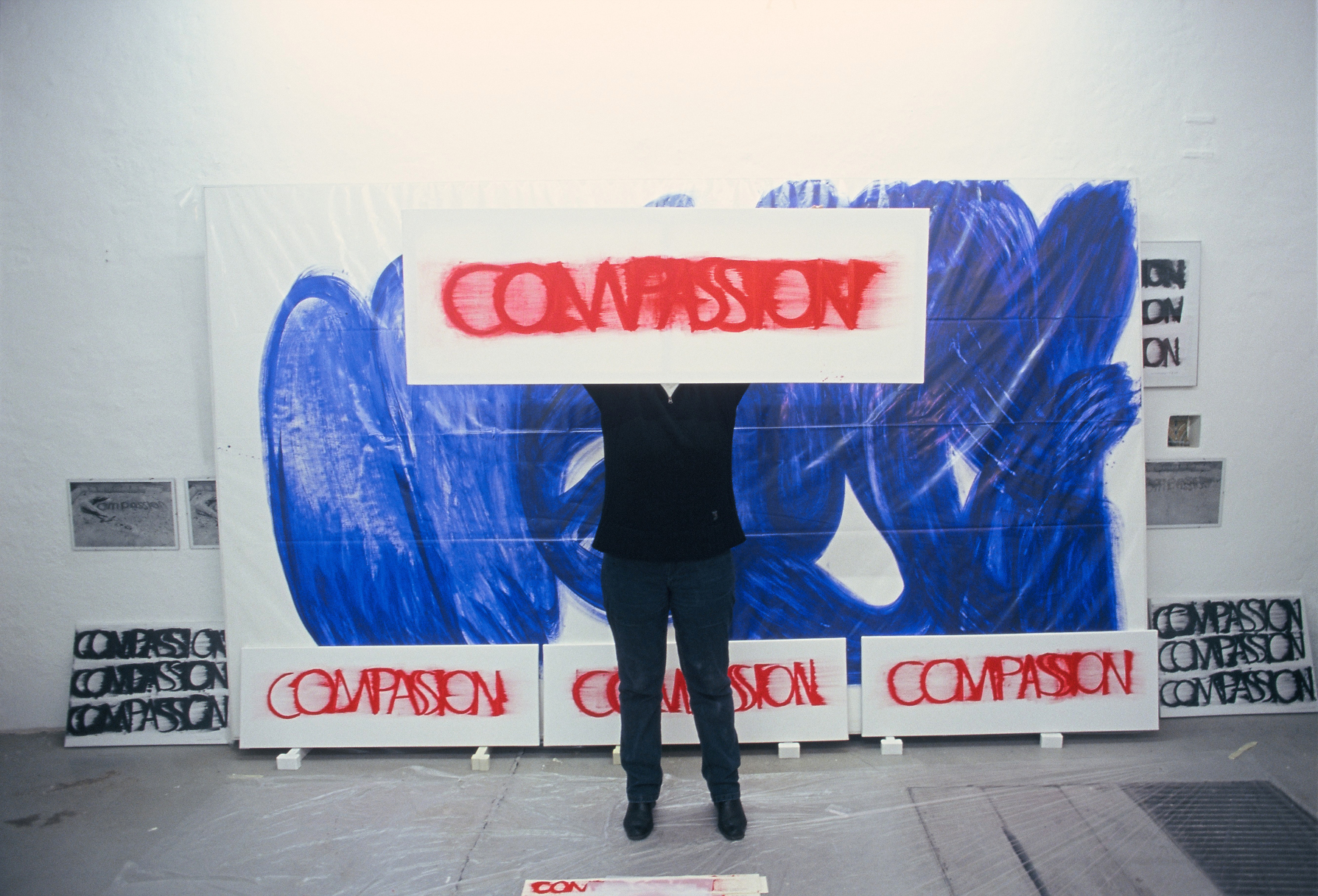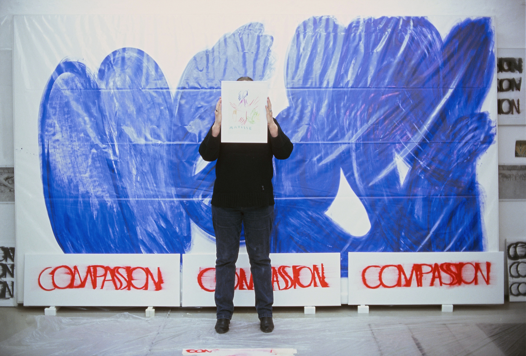 DIE BLAUE ZEIT FÜR ECCE HOMO BEGANN MIT 56 EXERZITIEN auf Karton(70cm x 100cm) +führte 1987 zum großen Tafelbild : MENSCH IN BLAU,1987 - 225cm x 357cm, das anlässlich der documenta in Kassel gezeigt wurde. Annalies Klophaus